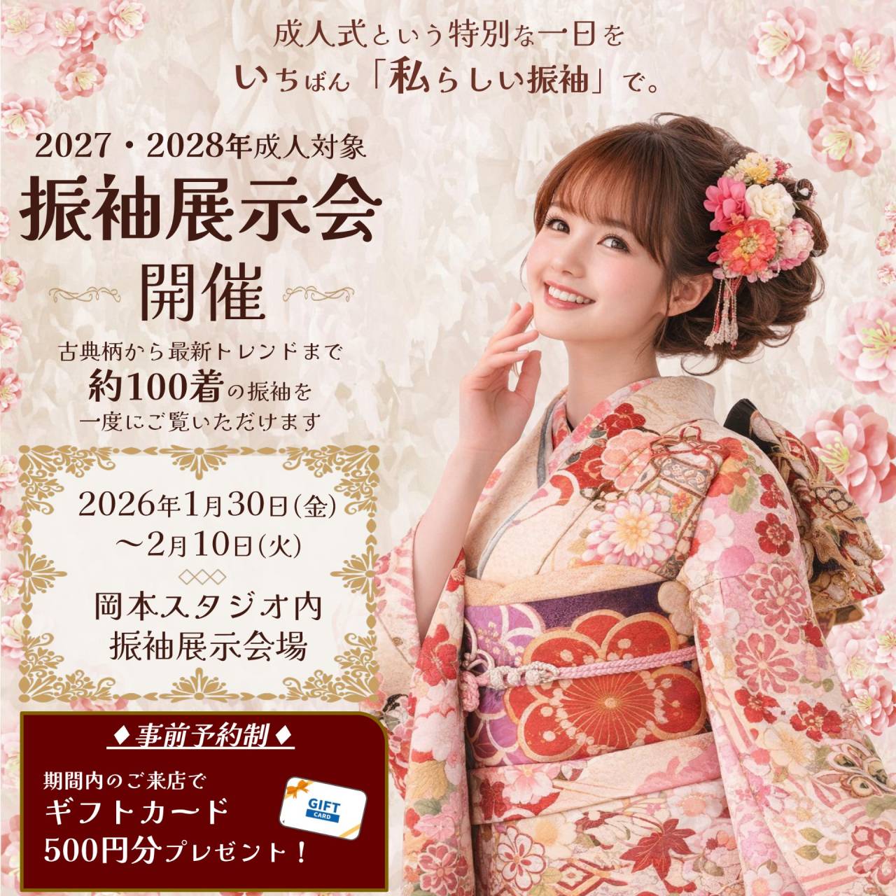 大阪府八尾市で写真撮影するなら岡本スタジオへ。近鉄大阪線"河内山本駅"から徒歩2分。七五三写真撮影はアンティークフォトが大好評!赤ちゃんやこどもだけの撮影はもちろん、家族写真やペットの写真も落ち着いたスタジオで撮影します。ウエディング写真、マタニティフォト、お宮参り写真、お食い初め写真、初節句写真(桃の節句・端午の節句)、月齢フォト、七五三写真、十三祝い写真、入園入学写真、卒園卒業写真、誕生日写真、成人式写真など丁寧に撮影する写真は絵画のような仕上がり。写真撮影は大阪の老舗写真館、岡本スタジオへお越しください。